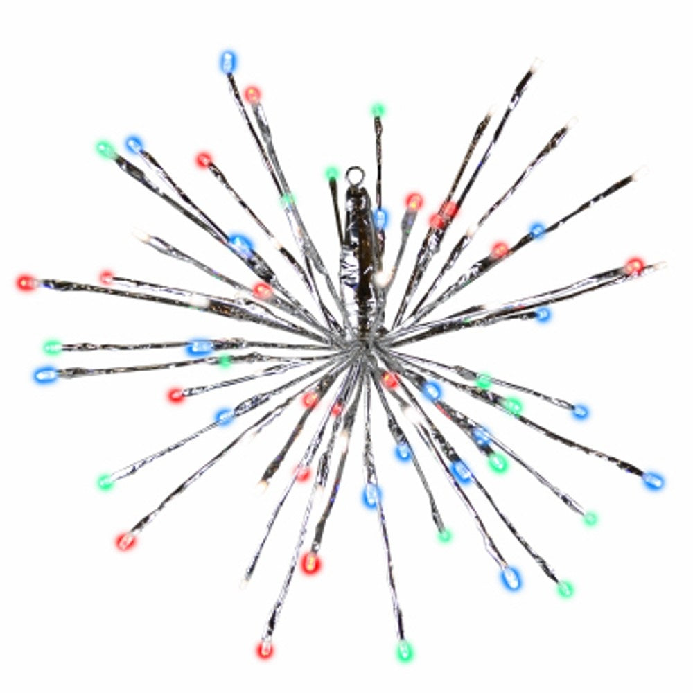 16", Multi Colored, 3 in 1 Radiant Blasts Light. Features a hanging hook, flat based stand and ground stake. 8 motion functions allow you to control the ambiance with the push of a button. With a built in memory function, this will return to the last chosen setting every time power is restored. 80 multicolored LED lights are situated on silver foil tape wrapped branches.