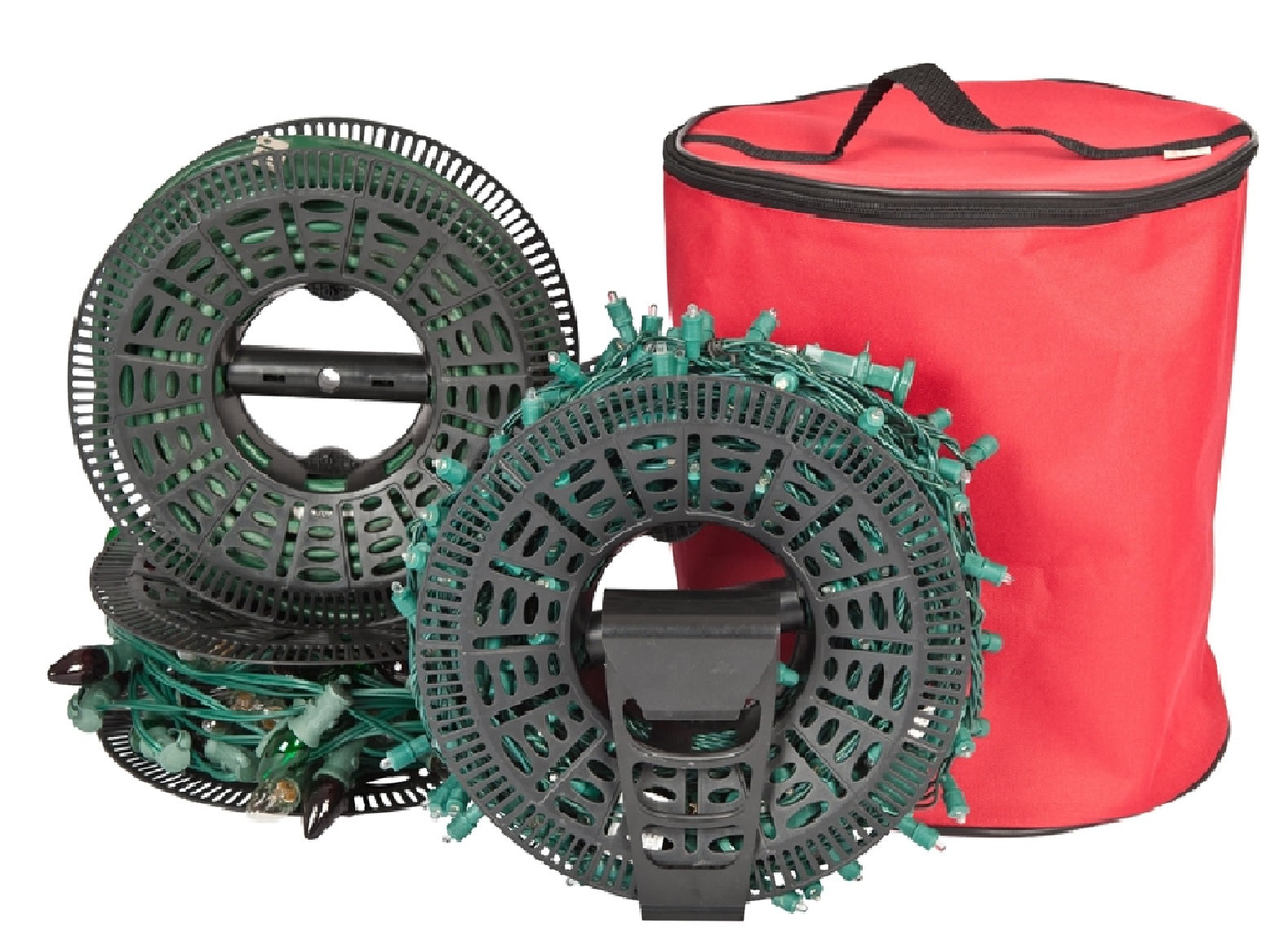 The store light storage system will keep your lights and extension cords tangle-free. Our spools hold more product than our competition's, up to 125' of mini lights.